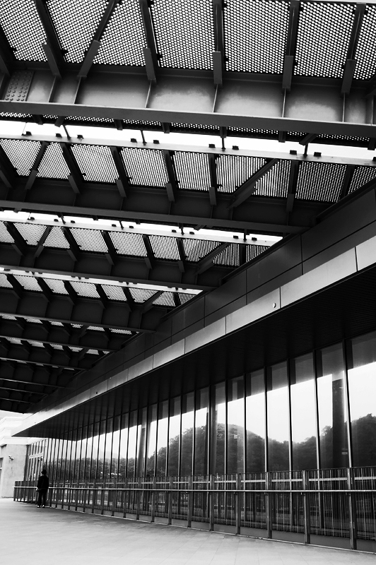 在長達一、二百米的展示長廊中,以金屬沖孔鋼、玻璃帷幕,串聯起新舊建築,透過戶外的自然光,形成數千個氣泡狀的光影灑落大廳,地板上則鑲嵌游魚形狀。
